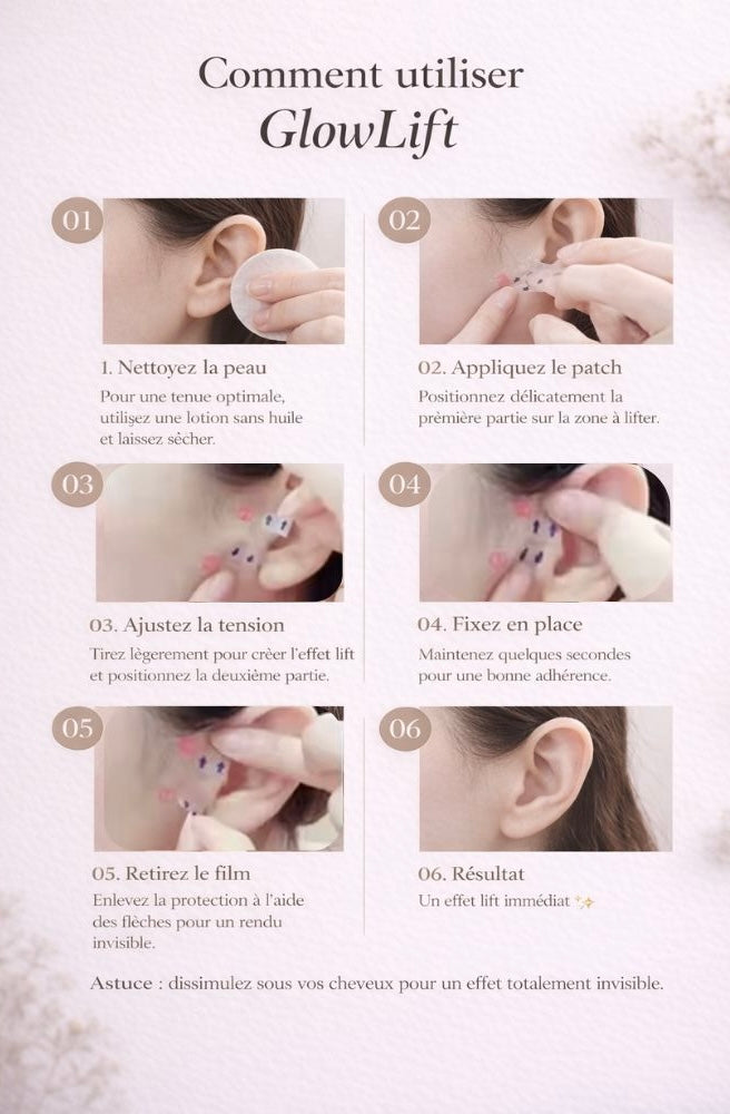 GlowLift agit grâce à un système de patch discret qui crée une légère tension sur la peau pour lifter visiblement les traits vers le haut. L’effet est immédiat et naturel.